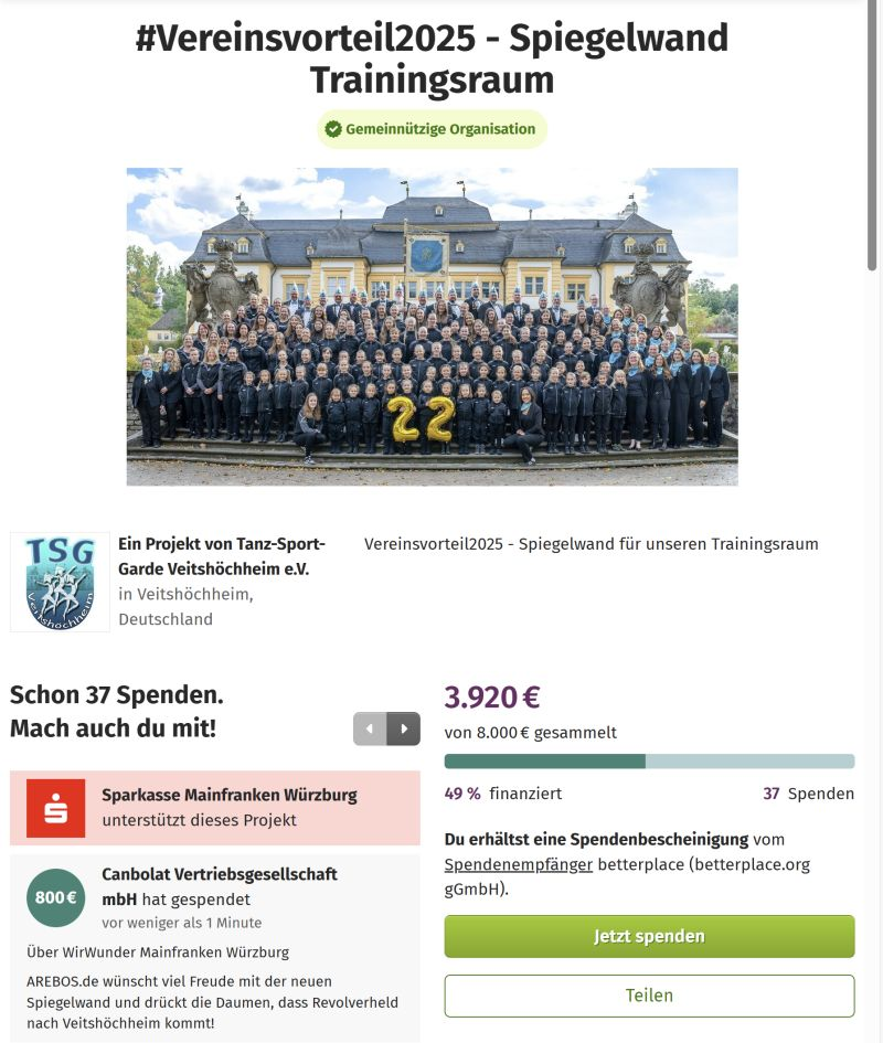 Wir freuen uns, die TSG Veitshöchheim mit einer Spende von 800 € zu unterstützen. Damit tragen wir zur neuen Spiegelwand im Trainingsraum bei – ein Projekt, das den Tänzerinnen und Tänzern bessere Trainingsbedingungen, Motivation und Teamgeist ermöglicht.